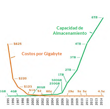 ● La razón principal del crecimiento de los datos es la drástica reducción del coste de su almacenamiento. Los costes de almacenamiento de datos han disminuido un 30-40 % cada año.