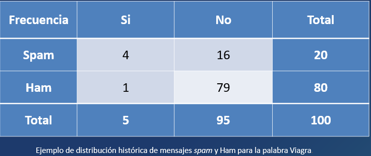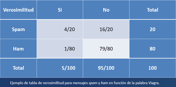 Es decir, con los datos anteriores, la probabilidad de que un correo electrónico que contenga la palabra Viagra sea spam es del 0,8.