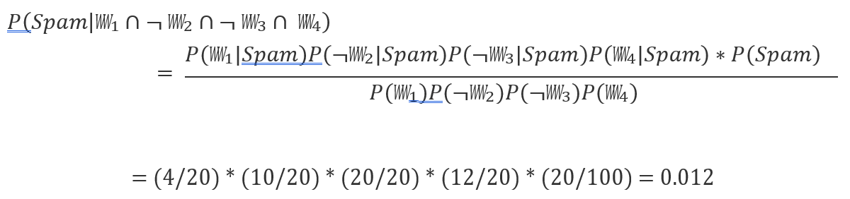 No obstante, al no poder asumir dependencia condicional por el alto coste computacional, el clasificador Naive Bayes asume independencia condicional entre los eventos condicionados al mismo valor de la clase. En nuestro ejemplo anterior, asumiendo independencia condicional de las palabras para obtener la probabilidad de spam, tendríamos la siguiente fórmula: