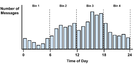 Este método es ideal cuando hay grandes cantidades de datos. Una buena solución suele ser explorar los datos para observar los puntos de corte en la distribución de los datos. Por ejemplo, el siguiente histograma sugiere realizar una división en cuatro bins.