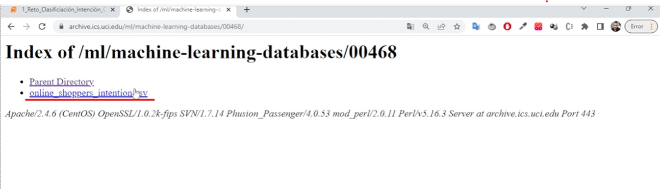 En donde se entrara al archivo “online_shoppers_intention.csv”y automáticamente empieza la descarga del archivo de información y aparecerá lo siguiente: