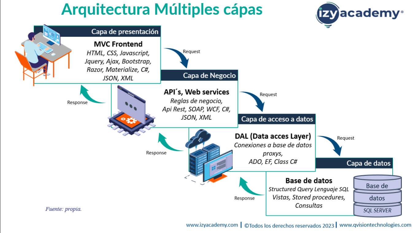 Normalmente, esta arquitectura se orquesta en mínimo tres capas, la primera capa es conocida como capa de presentación, la cual contiene toda la estructura de frontend, generalmente se construye con un proyecto de tipo MVC con Razor, Bootstrap, angular entre otras. Para casos de aplicaciones web, si hablamos de desarrollo móvil, el frontend estaría dado por la app desarrollada en diferentes tecnologías, pero esto se verá más adelante.