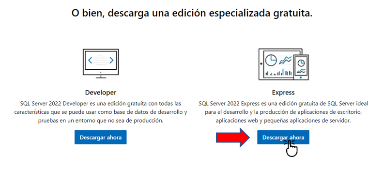 Procedemos a obtener el instalador para SQL server express, es posible usar múltiples versiones de SQL Server, ya que tenemos a SQL server azure, perimetral y entorno local, pero en este curso para los proyectos que estaremos desarrollando es mejor usar SQL Server Express.