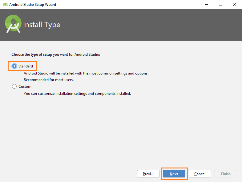 Ahora debemos escoger el tipo de configuración que Android Studio va a utilizar, en este curso se utilizará la configuración estándar. Para esto damos clic en la opción “Standard” y por último presionamos el botón “Next”.