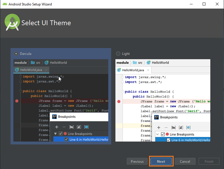 Luego, nos aparece una ventana en donde se puede escoger el tema con el que se iniciará la interfaz de Android Studio, luego de seleccionar el tema se hace clic “Next”.