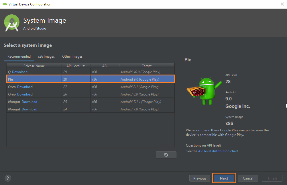 Ahora podremos observar los sistemas operativos que nos ofrece el programa con la información de su arquitectura, su versión de android y nivel de API. Lo que debemos hacer ahora es descargar el sistema operativo, que para el ejemplo utilizaremos el SO “Pie” y presionamos el enlace “Download”.