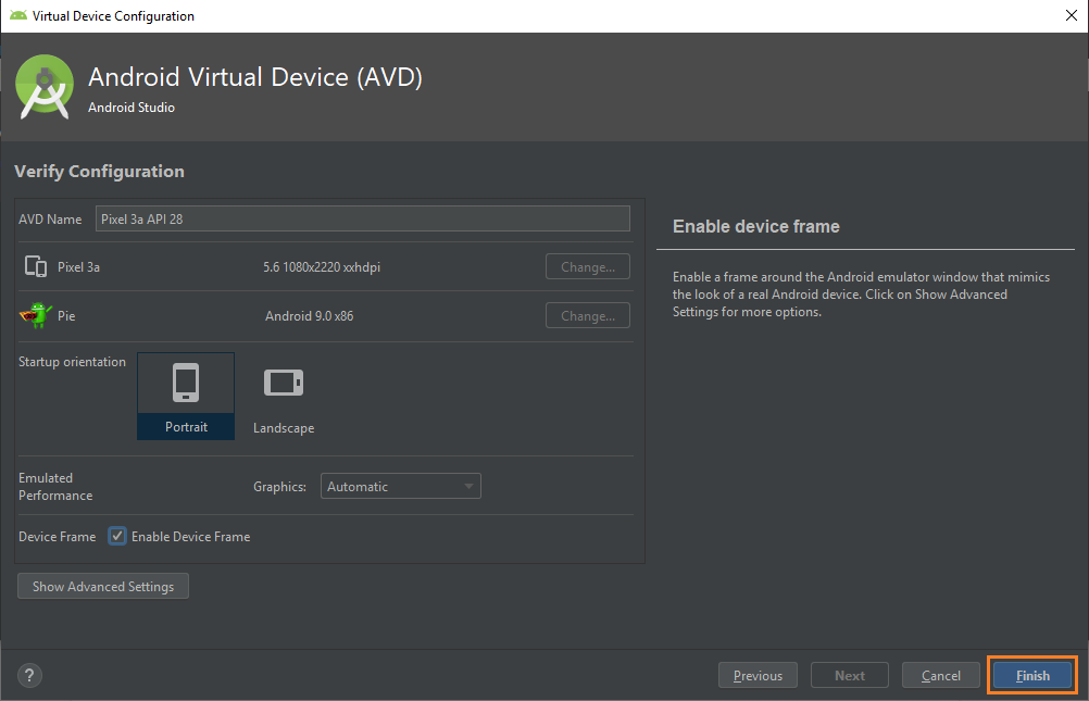 Ahora se muestra una ventana donde se puede configurar algunas opciones de nuestro dispositivo emulado como la orientación (vertical u horizontal), nombre de nuestro AVD (Dispositivo Virtual Android, sus siglas en español) o podemos ver más opciones. Nosotros simplemente dejaremos la configuración estándar y hacemos clic en el botón “Finish”.