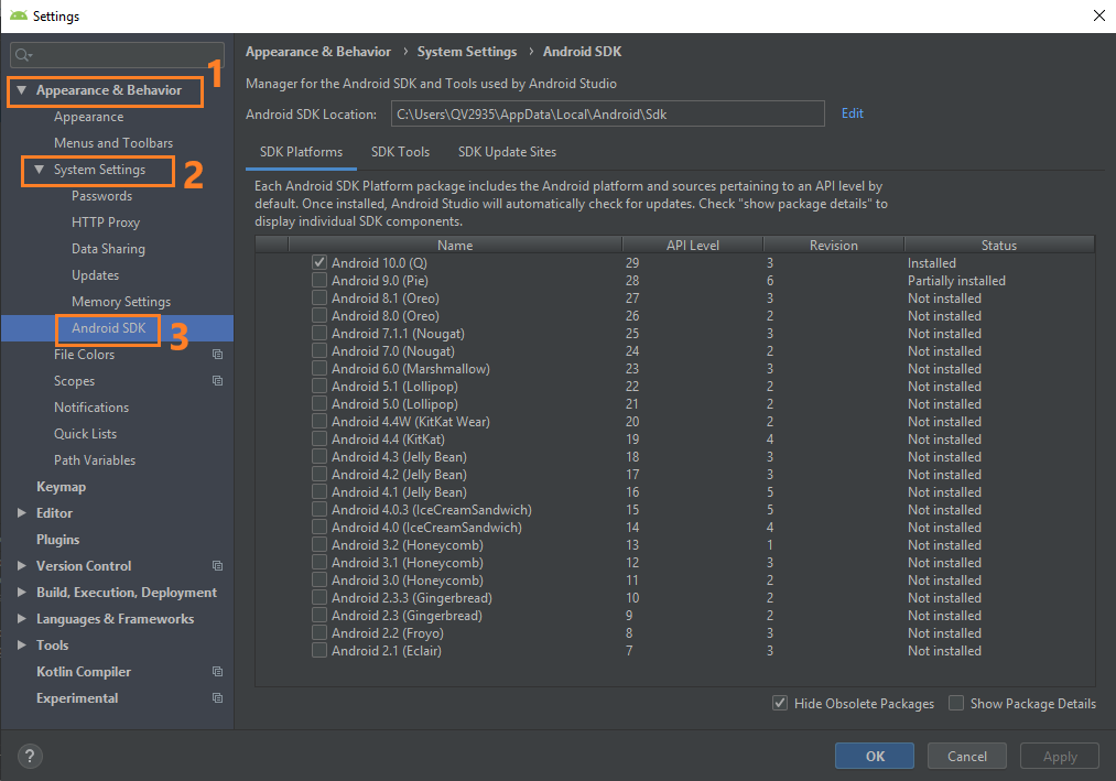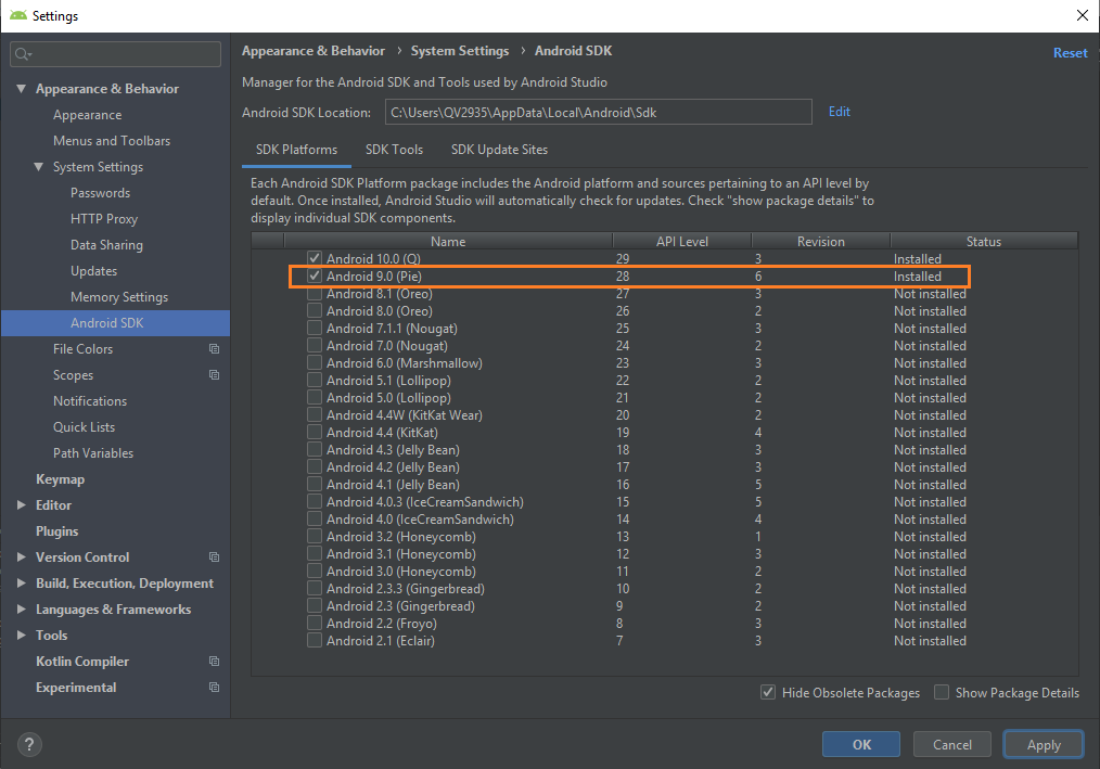 Como se puede visualizar en la imagen anterior, en la parte derecha se observan todos los sistemas operativos android que nos ofrece el programa Android Studio para emular y también se alcanza a ver que por defecto instala el sistema operativo Q versión 10.0, pero el que se instaló manualmente (Pie versión 9.0) está parcialmente instalado, entonces para instalarlo completamente hacemos clic en el cuadro que se encuentra al lado de “Android 9.0 (Pie)” y presionamos la el botón “Apply”.