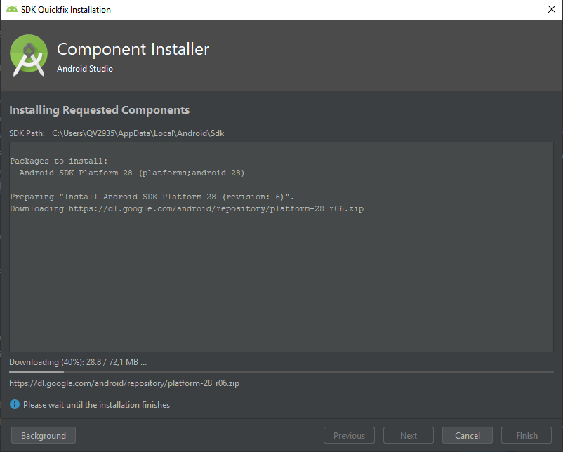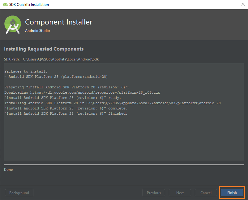 A continuación, se nos muestra una ventana en donde podemos observar todos los componentes SDK que se van a descargar para luego ser instaladas. En este paso simplemente debemos seleccionar el botón “Finish” para que inicie la descarga e instalación de estos componentes.