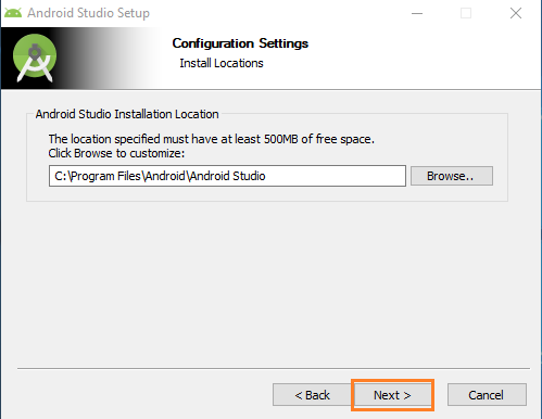 Después se visualiza una ventana donde podemos escoger la ruta en la cual se instalará Android Studio y “Next”. Se recomienda dejar la ruta por defecto.