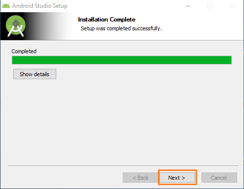 Una vez terminado la instalación, se nos visualizará una ventana mostrando que la instalación se realizó satisfactoriamente, pulsamos el botón “Next” y más adelante se muestra otra ventana donde dejamos seleccionada la opción “Start Android Studio” para que inicie el programa y presionamos el botón “Finish”.