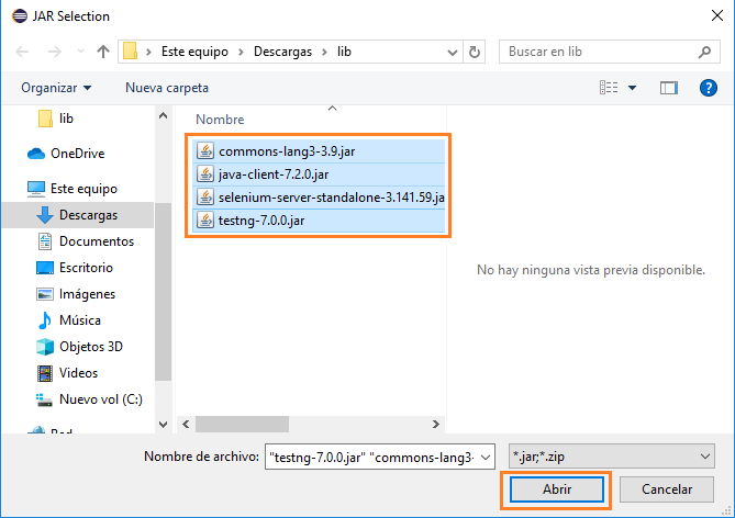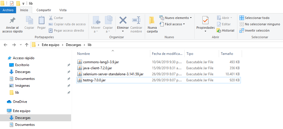 “selenium-server-standalone-3.141.59.jar” y “testng-7.0.0.jar”. Ya tenemos las