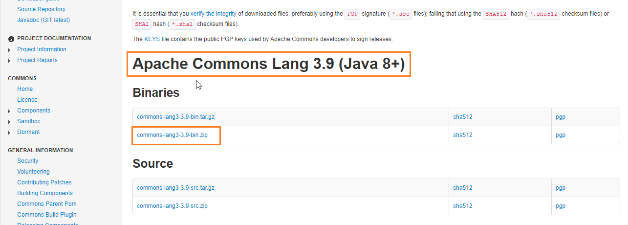 “commons-lang3-3.9-bin.zip” para iniciar la descarga del archivo .jar. Ahora que tenemos