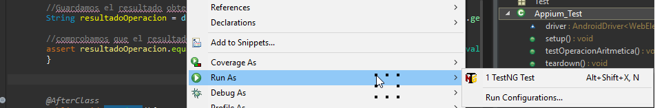 Para ejecutar el Test damos clic derecho sobre el código > Clic a Run As > Clic TestNG Test