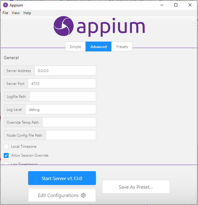 Lo primero que realizaremos será iniciar el servidor Appium, abrimos el aplicativo de appium y nos dirigimos a la pestaña “Advanced”