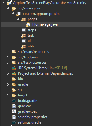 Dentro del paquete "co.com.appium.prueba" del directorio "src/main/java", crearemos los directorios que se encargarán de representar cada una de las capas de nuestro patrón de diseño, en nuestro caso usaremos el patrón de diseño Screenplay, de manera que necesitaremos como mínimo los paquetes: pages, steps, ui y a partir de allí todos los que consideremos necesarios, por ejemplo, se acostumbra a tener un paquete utils para almacenar allí las clases con funcionalidades transversales a la automatización.