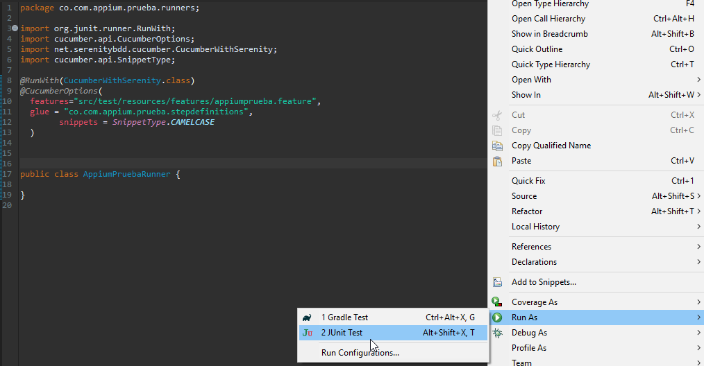 Para finalizar tenemos creada la clase AppiumPruebaRunner dentro del paquete runners esta es la clase principal desde donde lanzaremos la prueba.