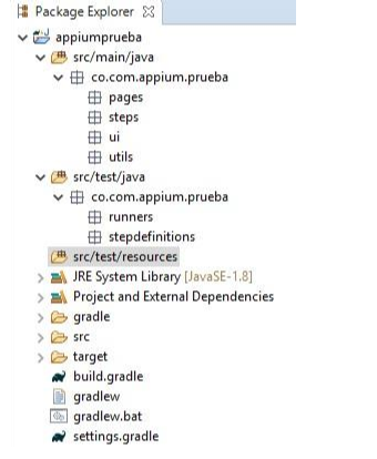 Al finalizar los pasos del asistente, en el panel del Project Explorer de Eclipse, veremos que se ha creado el proyecto "appiumprueba" el cual tiene la siguiente estructura