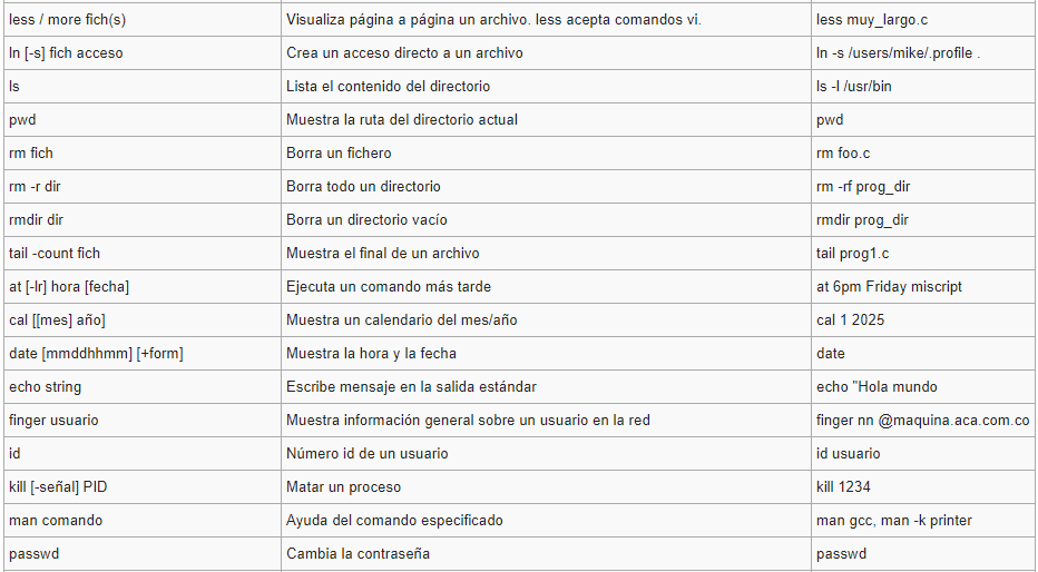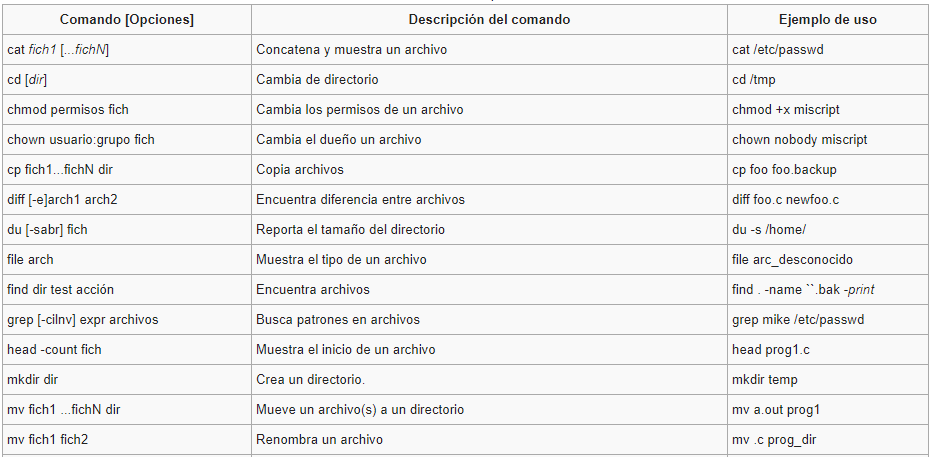 A continuación, se describe la forma de uso y funcionamiento de los comandos de usuario más importantes en el shell de Linux.