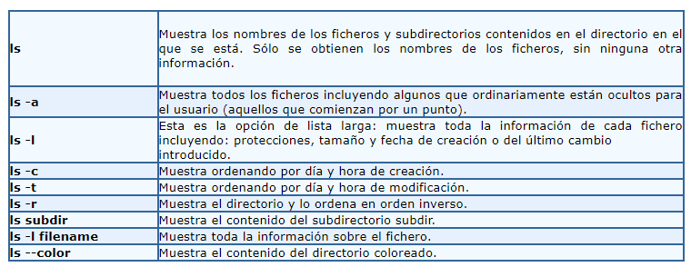 Las opciones anteriores pueden combinarse. Por ejemplo: ls -cr Muestra el directorio ordenando inversamente por fechas.