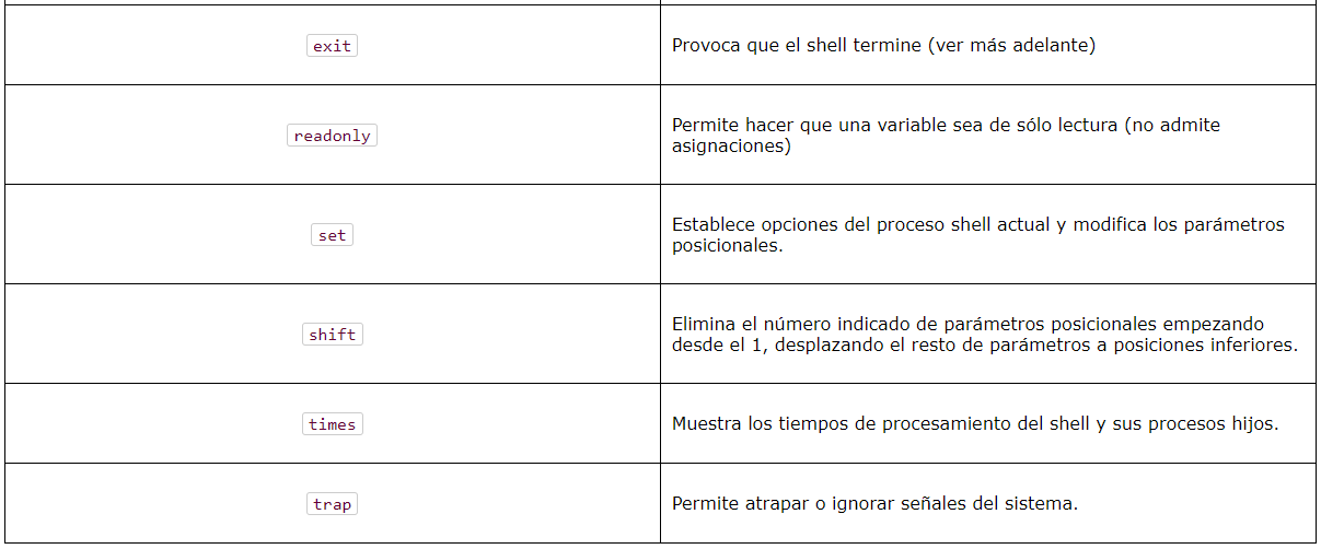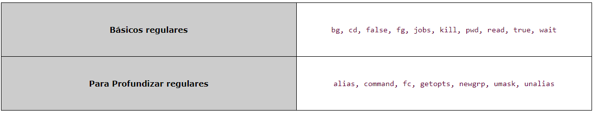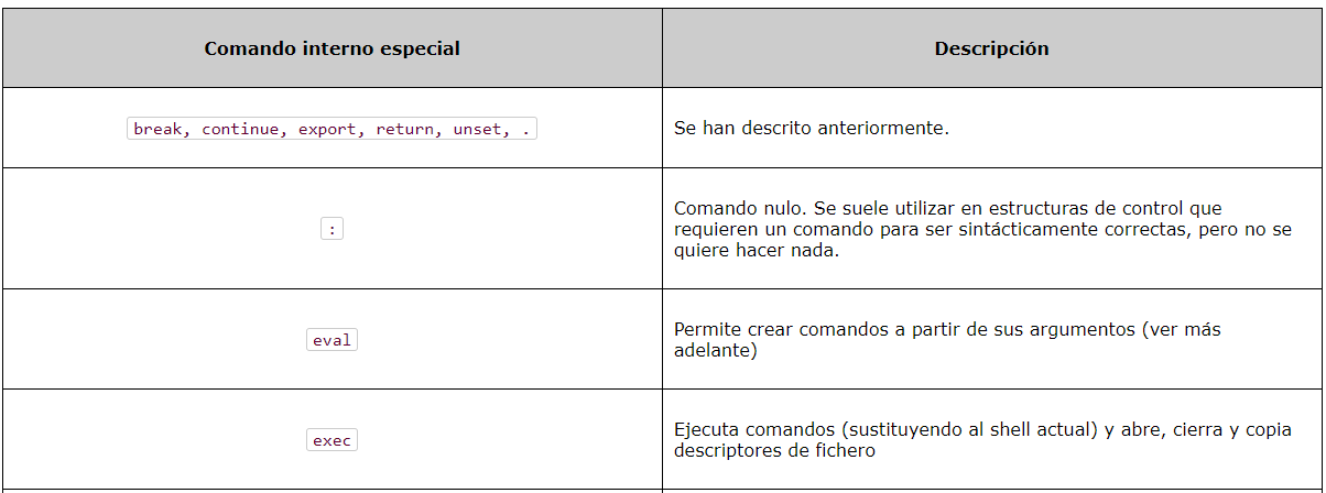 Los comandos internos corresponden a órdenes interpretadas por el propio shell (luego no existe ningún fichero ejecutable asociado al comando). Se distinguen dos tipos de comandos internos: