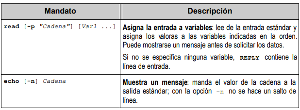 Ejemplo# Las siguientes instrucciones son equivalentes # Muestran un mensaje y piden un valor echo -n "Dime tu nombre: " read NOMBRE read -p "Dime tu apellido: " APELLIDO # Mostrar nombre y apellido printf "(%s) (%s)\n" $NOMBRE $APELLIDO