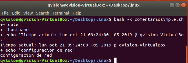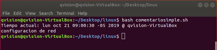 #!/bin/bash # Este es un simple script en el shell de linux # QVision Technologies echo "Tiempo actual : $(date) @ $(hostname)" echo "Configuracion de red"