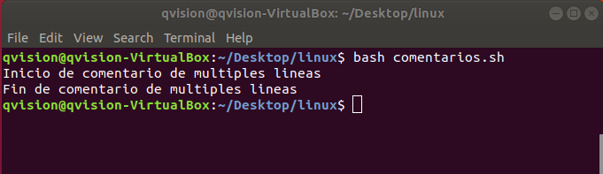 #!/bin/bash echo "Inicio de comentario de multiples lineas" <<COMMENT # -> Inicio comentario multiple Este es un comentario Que se puede realizar En multiples lineas COMMENT # -> Fin comentario multiple echo "Fin de comentario de multiples lineas"