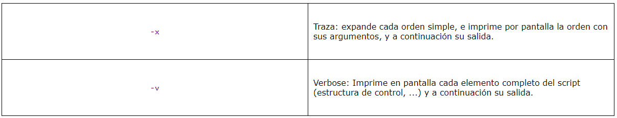 Si bien la programación de shell-scripts no se puede depurar fácilmente, los shells suelen ofrecer algunos mecanismos en este aspecto. En concreto, tanto "bash" como "dash" ofrecen los siguientes argumentos, que pueden usarse simultáneamente: