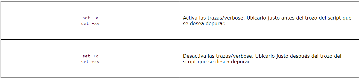 También es posible depurar sólo parte del script insertando en él los siguientes comandos (pueden usarse igualmente en la propia línea de comandos):