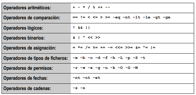 A modo de resumen, la siguiente tabla presenta los operadores utilizados en los distintos tipos de expresiones BASH.
