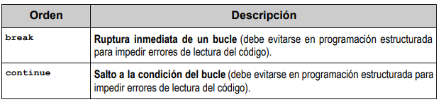 La siguiente tabla describe las 2 órdenes especiales que pueden utilizarse para romper el modo de operación típico de un bucle.