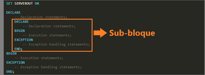 A continuación, se muestran en las siguientes imágenes la estructura de un bloque PL/SQL y un bloque que contenga otro bloque.