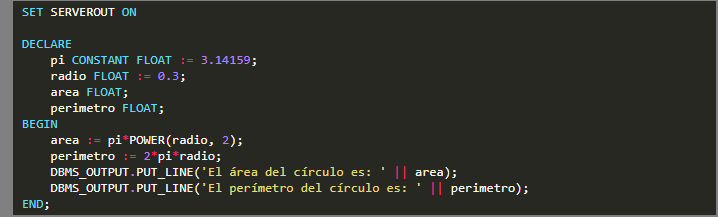 Vemos que nos sale un error en el código debido a que cuando declaramos la variable “pi” en la sección DECLARE no la inicializamos inmediatamente, sino que se hizo más adelante en la sección BEGIN.