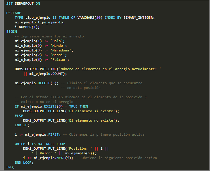 Estos arrays también pueden usar índices negativos y si se intenta leer el dato de una posición no inicializada se genera un error NO DATA FOUND.