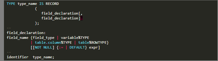 Los Recrods se utilizan para tratar como unidad lógica tipos de distintos que guardan relación. Este tipo de dato compuesto debe contener uno o más componentes (llamados campos) de cualquier tipo: escalar, Record o INDEX BY table.