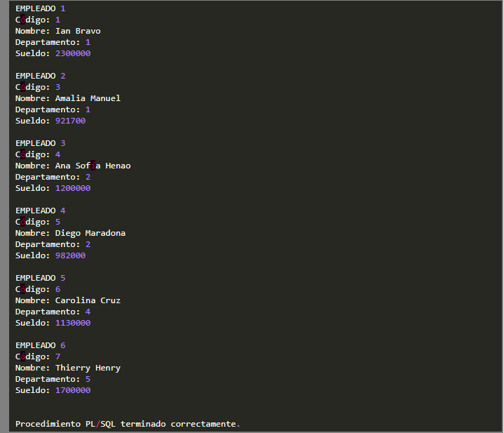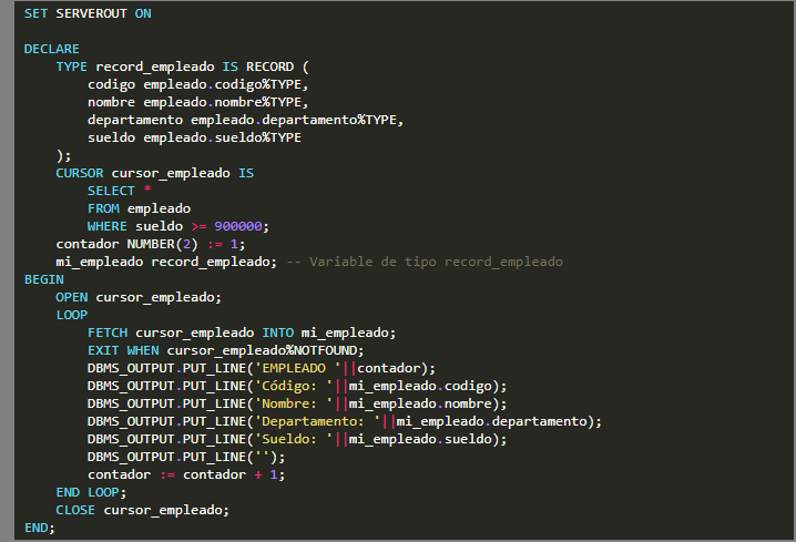 Ahora procedemos a crear un RECORD con nombre record_empleado el cual almacenará todos los atributos del empleado. Luego creamos un cursor llamado cursor_empleado que recuperará aquellos empleados que tienen un sueldo mayor o igual a 900000 y los mostrará en pantalla.