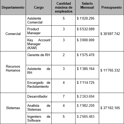 En la siguiente tabla se muestra los nombres de los departamentos, cargos, cantidad máxima de empleados que se admite en cada cargo, el salario mensual del empleado y el presupuesto que tiene cada departamento de la empresa Q-Vision para pagar la nómina de sus empleados.