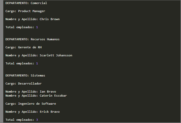 Mensualmente la empresa requiere sacar un informe de los nombres de los empleados que hay en cada departamento. El informe consta del nombre del departamento, luego los cargos, dentro de cada cargo los nombres de los empleados que laboran en él, y por último se debe mostrar la cantidad de trabajadores que hay actualmente en dicho departamento. Ahora mostramos un ejemplo de cómo se debería ver un informe.
