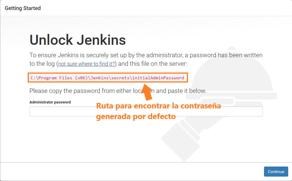 Cuando estemos en la ruta que se nos indicó en la imagen anterior, abrimos el archivo “initialAdminPassword” ya sea mediante el bloc de notas, notepad++ o cualquier editor de texto que usted desee, copiamos la contraseña, luego la pegamos en donde nos piden la clave y por último le damos clic en el botón “Continue”.