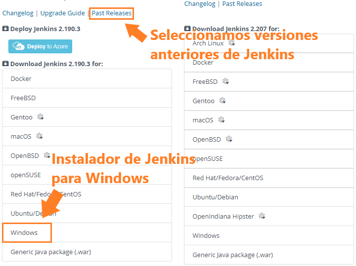 Adicionalmente podemos descargar versiones anteriores de Jenkins si damos clic en la opción “Past Releases”.