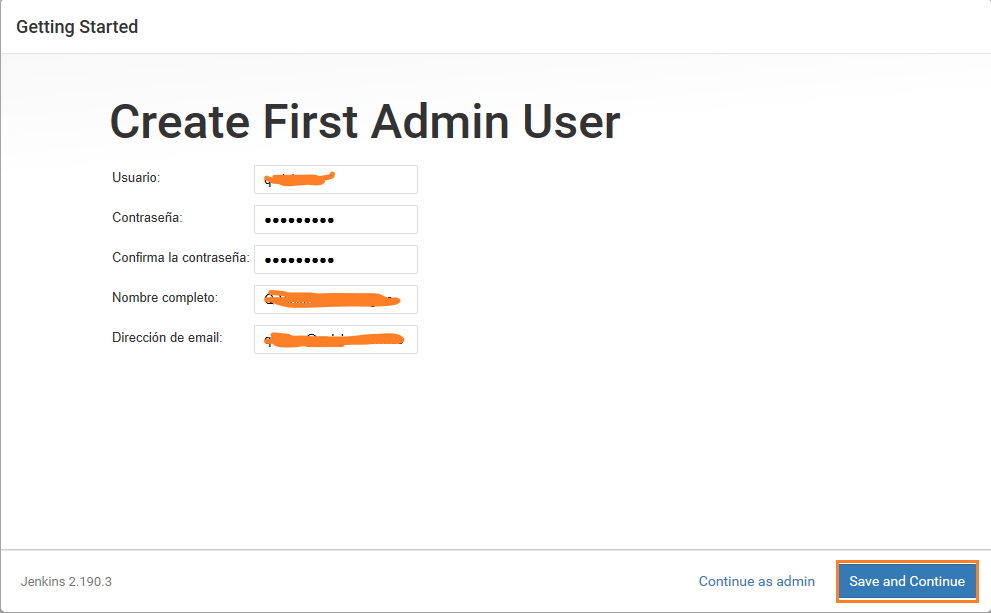 Luego de que se instalen los plugins nos aparecerá una ventana para crear la cuenta del usuario administrador, en esta pantalla llenamos los datos que nos piden y por último presionamos el botón “Save and Continue”.