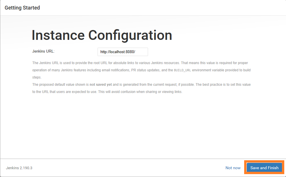 Más adelante, aparece una ventana en donde establecemos la URL para vincular los recursos de Jenkins y así garantizar el correcto funcionamiento de sus características. Recomendamos en estos momentos dejar la dirección que está por defecto que es la de http://localchost:8080/. Una vez hecho esto, le damos clic en el botón “Save and Finish”.