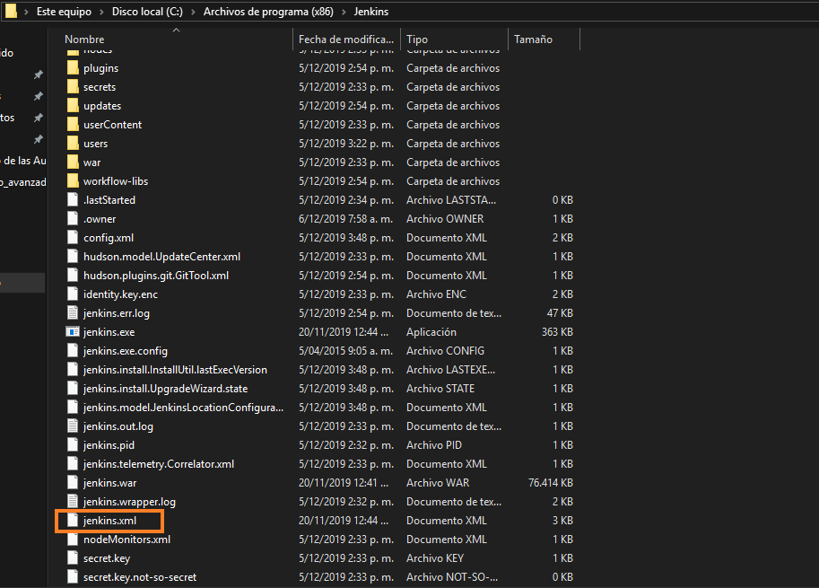 Cuando esté en la carpeta de Jenkins, tenemos que buscar un archivo con nombre “jenkins.xml”.