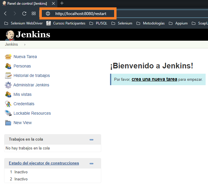 Luego de haber hecho el cambio de puerto en el archivo, nos dirigimos a el navegador donde tenemos iniciado Jenkins y en la barra de direcciones escribimos la siguiente URL: http://localhost:8080/restart para reiniciarlo.
