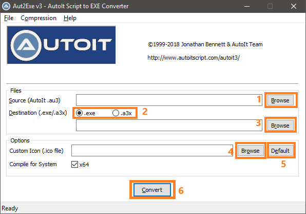 Es posible coger los scripts .au3 y compilarlo en un ejecutable independiente el cual se puede usar sin la necesidad de tener AutoIt instalado y sin tener AutoIt3.exe en el ordenador. El proceso de compilación convierte el script, los archivos en el #include y cualquier otro archivo agregado por la función FileInstall en una forma simbólica que luego se comprime y encripta. Por este motivo ninguno de los archivos adicionales son necesarios en tiempo de ejcución.