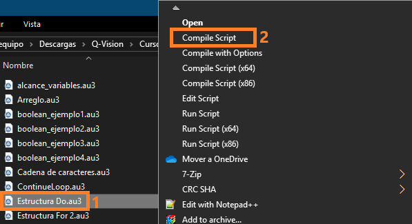 Para ejemplificar esta forma de compilación, buscamos el ejemplo que hicimos del script Estrcutura Do, le damos clic derecho para ver el menú emergente y por último presionamos la opción “Compile Script”.