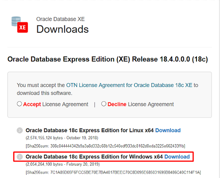 Descargar Oracle Database 18c Express Edition para Windows de 64 bits.