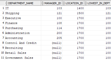 SELECT department_name,manager_id,location_id,LAST_VALUE(manager_id) IGNORE NULLS OVER (PARTITION BY location_id ORDER BY location_id asc) AS lowest_in_dept FROM departments;NER JOIN vista_2 |