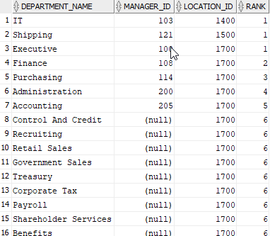 SELECT department_name,manager_id,location_id, RANK() OVER ( PARTITION BY location_id ORDER BY location_id ASC, manager_id ASC ) AS RANK FROM departments; |